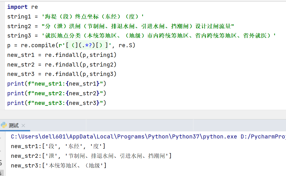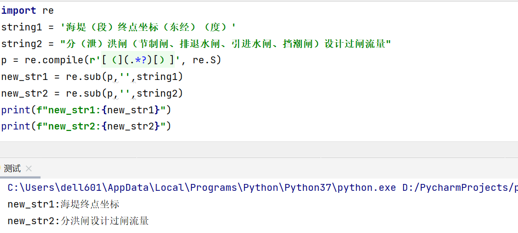 import restring1 = '海堤(段)终点坐标(东经)(度)'string2 = "分(泄)洪闸(节制闸、排退水闸、引进水闸、挡潮闸)设计过闸流量"p = re.compile(r'[(](.*?)[)]', re.S)new_str1 = re.sub(p,'',string1)new_str2 = re.sub(p,'',string2)print(f"new_str1:{new_str1}")print(f"new_str2:{new_str2}")