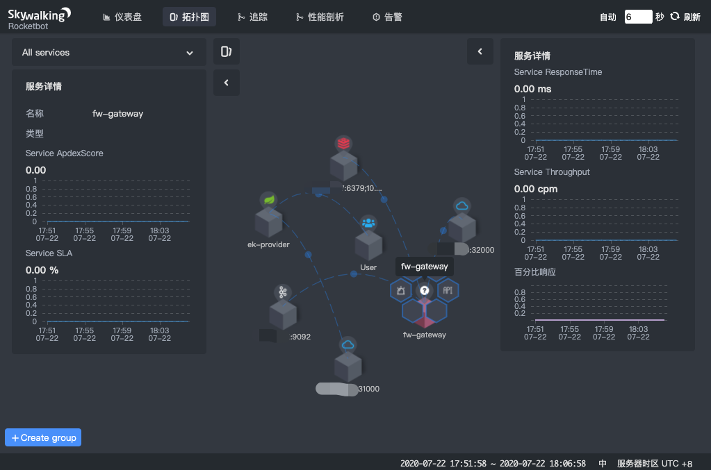 Connected to the target VM, address: '127.0.0.1:61863', transport: 'socket'DEBUG 2020-07-22 17:53:35:179 main AgentPackagePath : The beacon class location is jar:file:/Users/lizz/Documents/workspace/skywalking8/skywalking-agent.jar!/org/apache/skywalking/apm/agent/core/boot/AgentPackagePath.class. INFO 2020-07-22 17:53:35:184 main SnifferConfigInitializer : Config file found in /Users/lizz/Documents/workspace/skywalking8/config/agent.config. INFO 2020-07-22 17:53:35:534 main SnifferConfigInitializer : Agent options is agent.service_name=fw-gateway,collector.backend_service=10.2.20.12:11800. 17:53:41.327 [SkywalkingAgent-5-GRPCChannelManager-0] DEBUG org.apache.skywalking.apm.dependencies.io.netty.util.internal.PlatformDependent - Platform: MacOS17:53:41.334 [SkywalkingAgent-5-GRPCChannelManager-0] DEBUG org.apache.skywalking.apm.dependencies.io.netty.util.internal.PlatformDependent0 - -Dio.netty.noUnsafe: false... 访问相关服务地址后可以在SW控制台中查看相关信息
