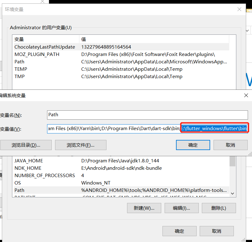如上图所示需要把E:\flutter_windows\flutter\bin目录配置到path环境变量里面。
