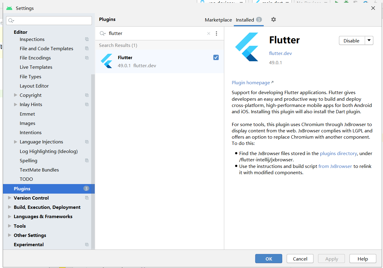 6、打开Android Studio安装Flutter插件:File>>Setting>>Plugins搜索Flutter安装并重启IDE。