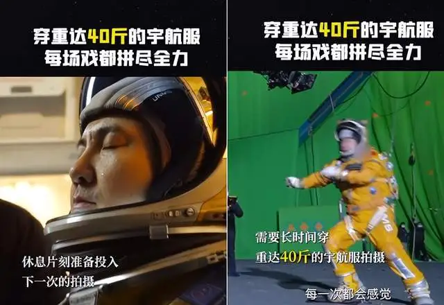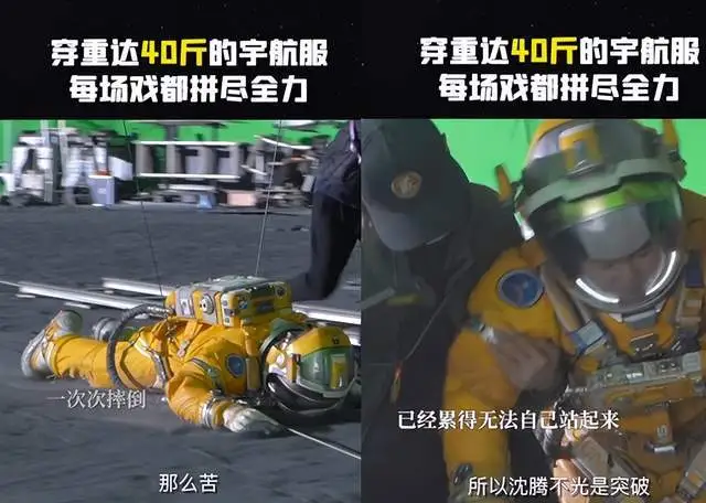 视频中,沈腾在拍摄现场闷热的环境中,需要穿着重达40斤的宇航员戏服。虽然穿上去看起来风范十足,但他需要背负着这样的重量,一次次被威亚托在地上爬行,这样的动作难度,可想而知。