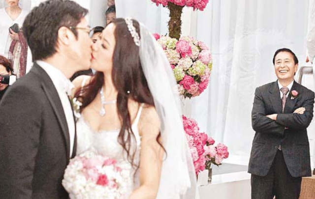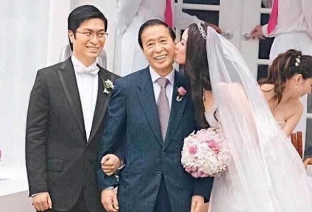 婚礼上,徐子淇和丈夫李家诚甜蜜亲吻,站在一旁的公公李兆基喜笑颜开,可见对这个儿媳妇非常满意。