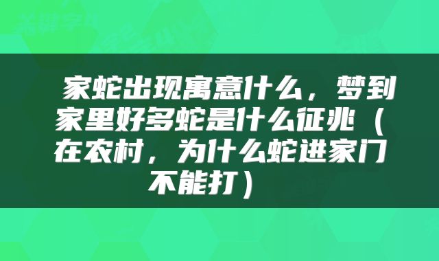 - 1、家蛇出现寓意什么:梦到家里好多蛇是什么征兆 梦见家里好多蛇是什么意思
