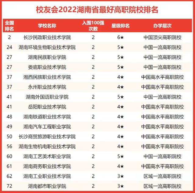 在湖南省高职院校排名中,长沙民政职业技术学院、湖南环境生物职业技术学院、湖南民族职业学院居榜单前3名,是湖南省最好的高职院校。