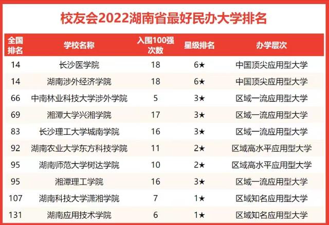 在湖南省民办高校排名中,长沙医学院、湖南涉外经济学院、中南林业科技大学涉外学院居榜单前3名,是湖南省最好的民办大学。