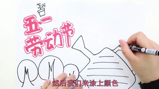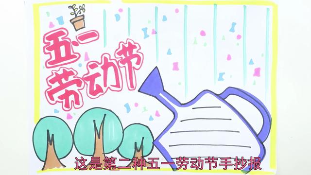 1、接下来教大家画第二种,五一劳动节的手抄报,先来写出五一劳动节,我们选择红色,右边我们可以画上一个水壶的形象,作为文本框,我们画上小树作为装饰;