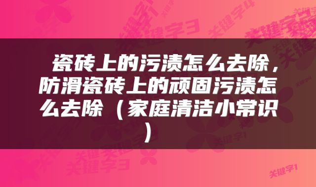 本文关键词:防滑瓷砖上的美缝剂怎么去除,如何去除瓷砖顽固污渍,防滑瓷砖上的顽固污渍怎么去除干净,如何祛除瓷砖上的污渍,防滑瓷砖污渍擦不掉怎么办。这就是关于《瓷砖上的污渍怎么去除,防滑瓷砖上的顽固污渍怎么去除(家庭清洁小常识)》的所有内容,希望对您能有所帮助!